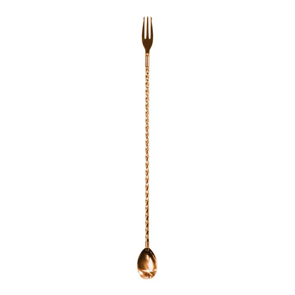 With a reinforced spoon head, trident garnish tip, and a hand-twisted stainless steel shaft that resists bending, this copper-finished spoon combines durability with elegance.